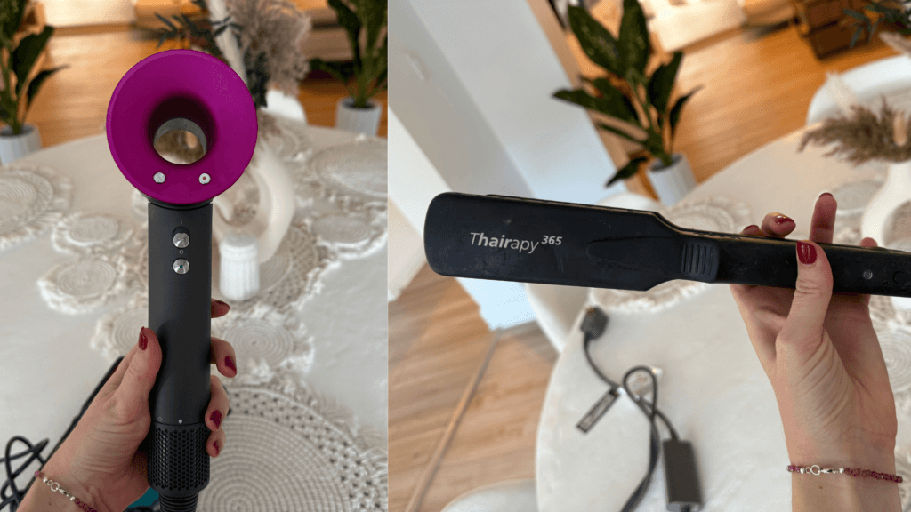The Dyson dries hair quickly without excessive heat, which helps maintain shine and reduce long-term damage. The Thairapy flat iron smooths hair without frying it, which matters when you style frequently but still prioritize hair health.