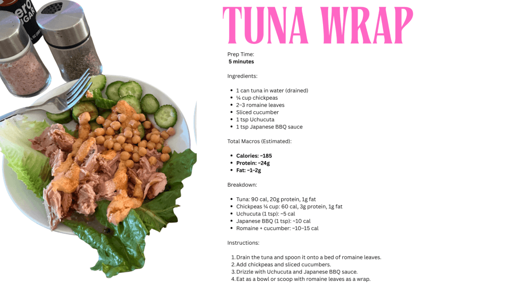Now that you have the essential proteins and bases, let’s get cooking! Each recipe averages 5 minutes. Ultra easy and ultra low calorie while also getting a good amount of protien in.